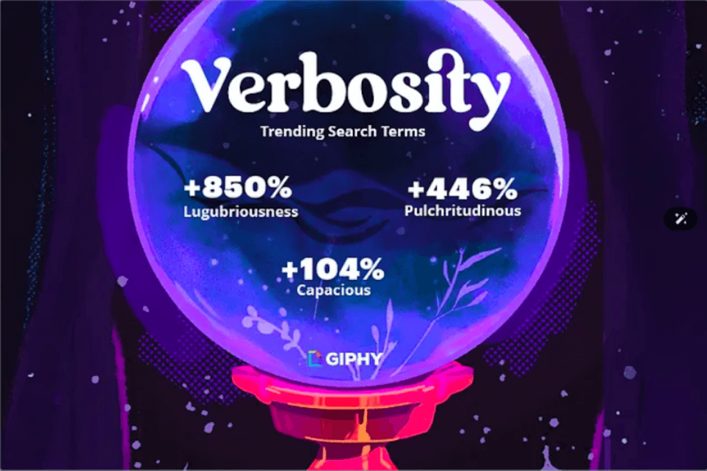 過去我們說「ASAP」,如今變成了「expeditiously(即刻)」。2024 年,用戶開始在群聊中頻繁使用「大學級」詞彙,如「lugubriousness(哀傷)」、「pulchritudinous(美麗)」,以及「capacious(寬廣)」。GIPHY 數據顯示,這些複雜詞彙的搜尋量顯著上升,2025 年預計將有更多人擺脫「腦袋宕機式表達」,用繁複辭藻來提升溝通質感。