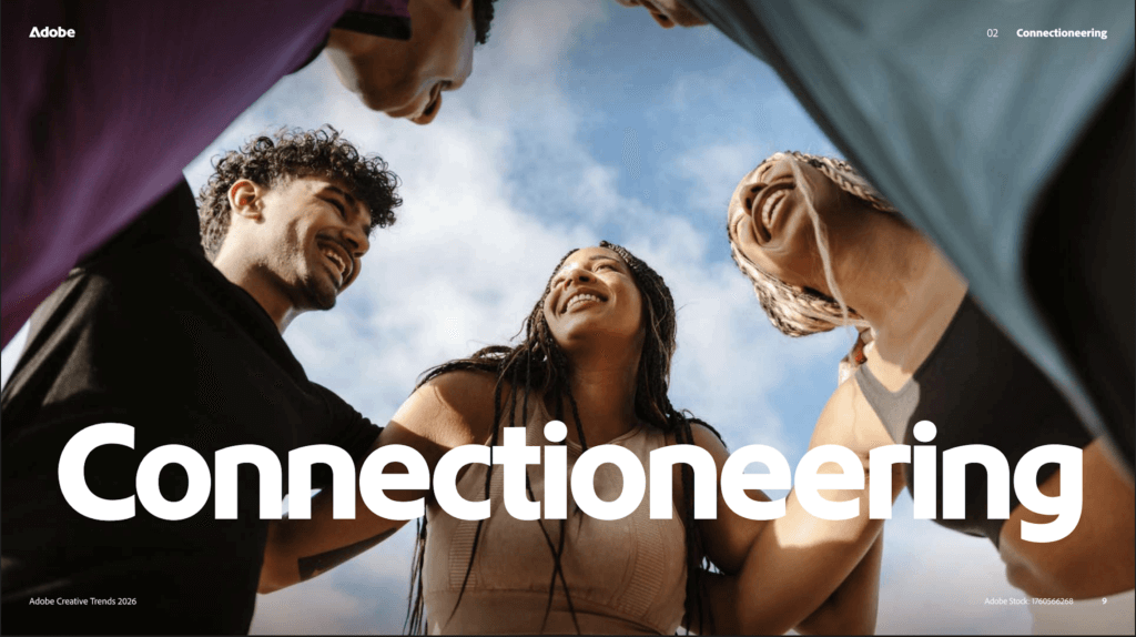 情感連接術(Connectioneering)透過精心設計時刻,傳遞共享喜悅、靈感或親情,讓觀眾忽略品牌而沉浸訊息。消費者決策多建立於情緒,此風格可橋接區域與產業,音樂與視覺強化普世價值,形成跨文化共鳴。Adobe 強調:人們渴望連結人類共通體驗,如家庭溫暖或成就喜悅。掌握這些情緒,即可機會化為規劃決策的利器。