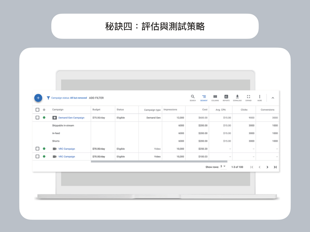 ② 廣告上線後,請查看素材資源報表中的參與度指標 (例如點閱率),找出成效最好的素材資源,並將成效不彰的素材資源換成新的變化版本,力求質量兼備。