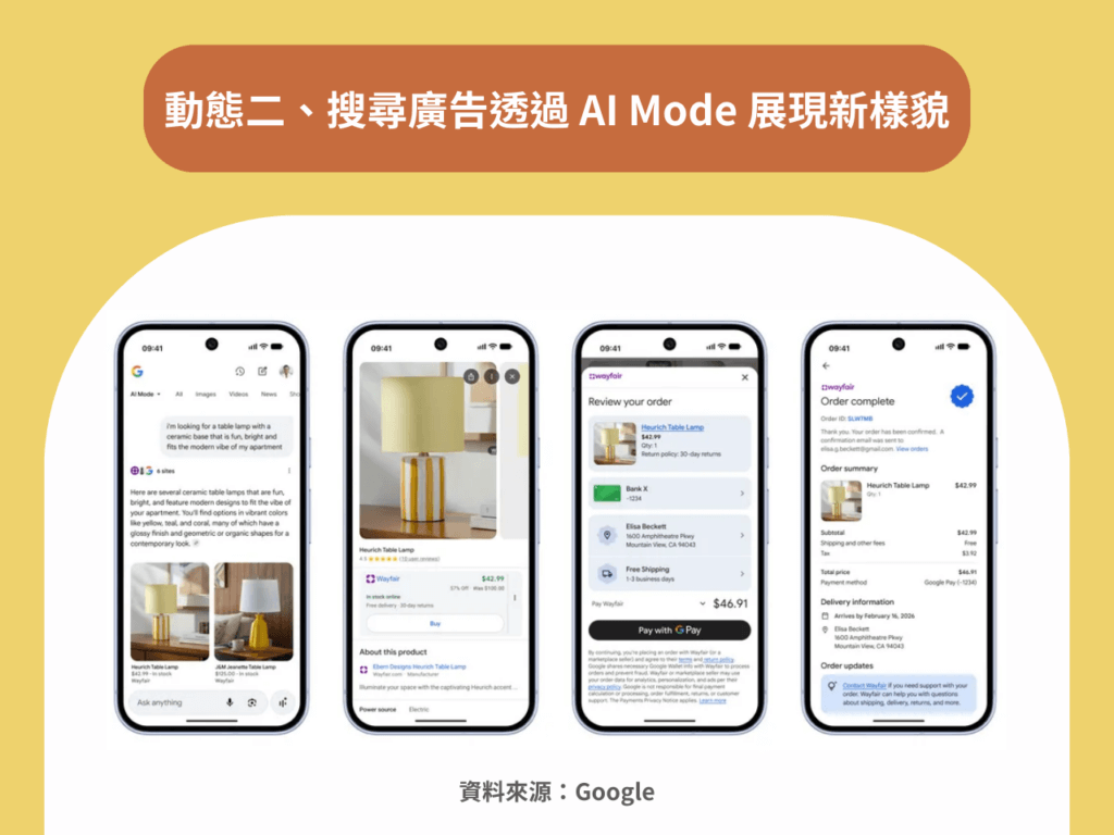 ② 已在 Google 搜尋 AI Mode 與 Gemini App 實作:美國用戶可直接從 Etsy、Wayfair 買東西(Shopify、Target、Walmart 即將上線),全程無跳轉、無摩擦。