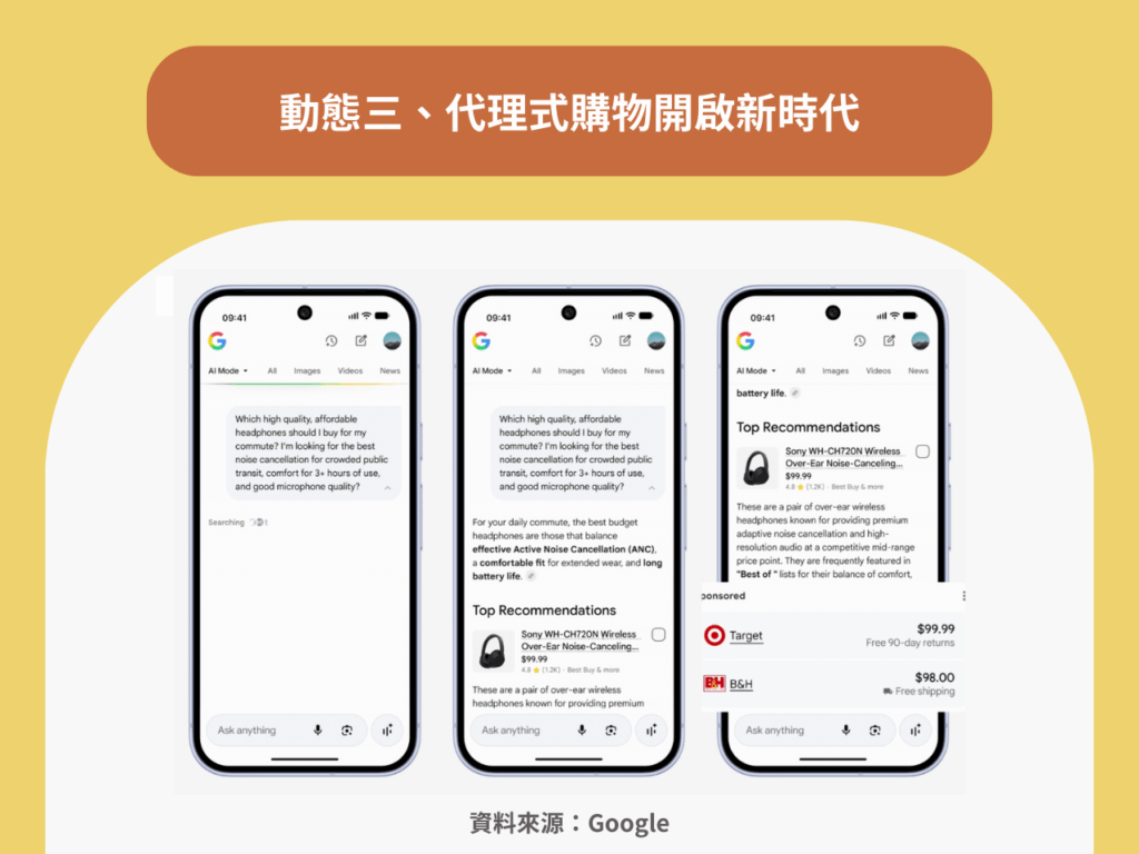② 指標從點擊轉 ROI:Gemini 讓創意與投放自動迭代,重點追蹤「代理購物轉單率」。