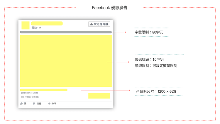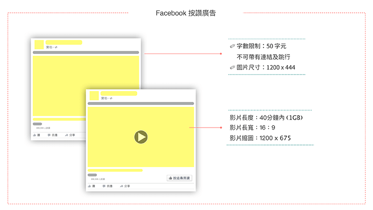 - 圖像中的文字比例若超過 20% 可能會減少投遞次數,建議發佈廣告前可以先到 圖像檢測網站,若有其他一律也可以先到 Facebook 廣告說明中心 查詢。