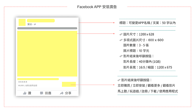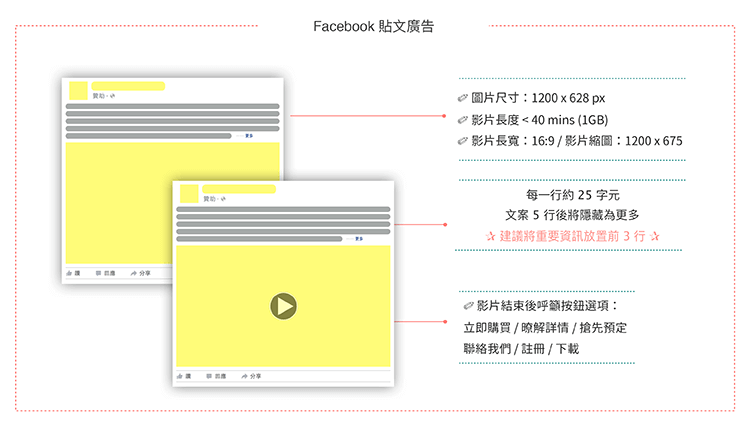 ⚠️ 請注意:圖像中的文字比例「不得」超過整體 20%,否則會發生減少投遞次數的狀況,更詳細的內容可至 Facebook 政策中心 查看。 - 行動呼籲按鈕
