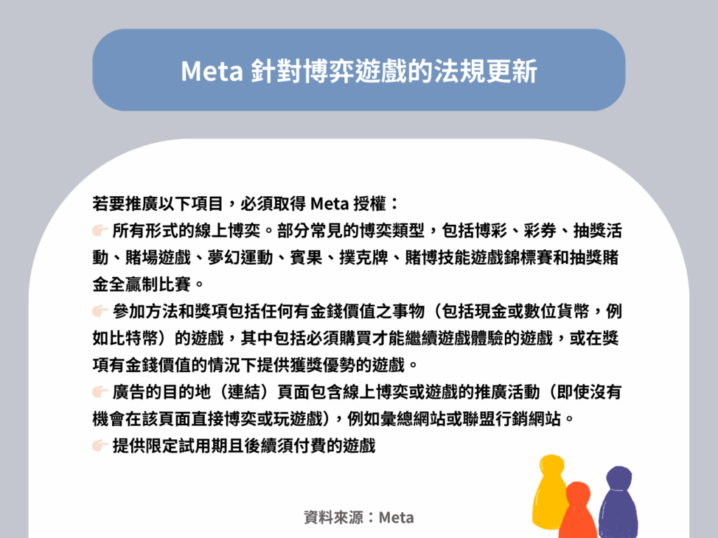在追求轉換的同時,「合規」是所有廣告主必須堅守的紅線。Meta 更新了其關於「真錢博弈與博弈遊戲」的廣告規範,這對於金融、遊戲以及電商產業的行銷人具有重要的參考價值。重點如下: