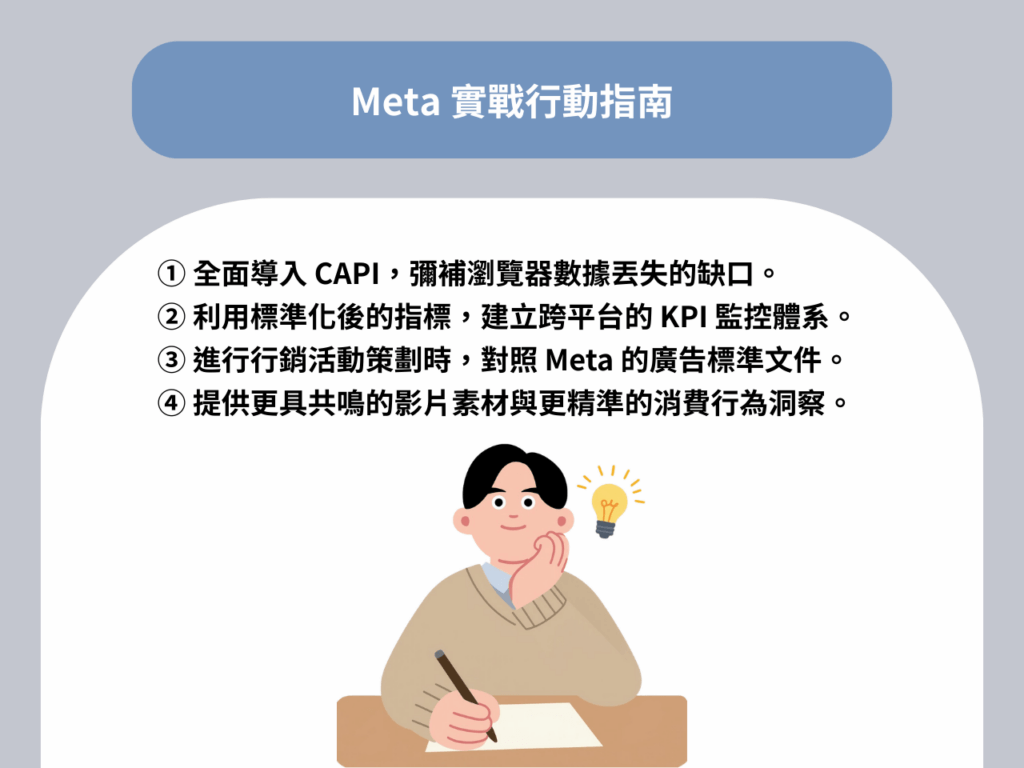 ② 重塑衡量架構:利用 Meta 標準化後的指標,建立一套跨平台的 KPI 監控體系。不再執著單一平台表現,關注全通路(Omnichannel)的貢獻度。