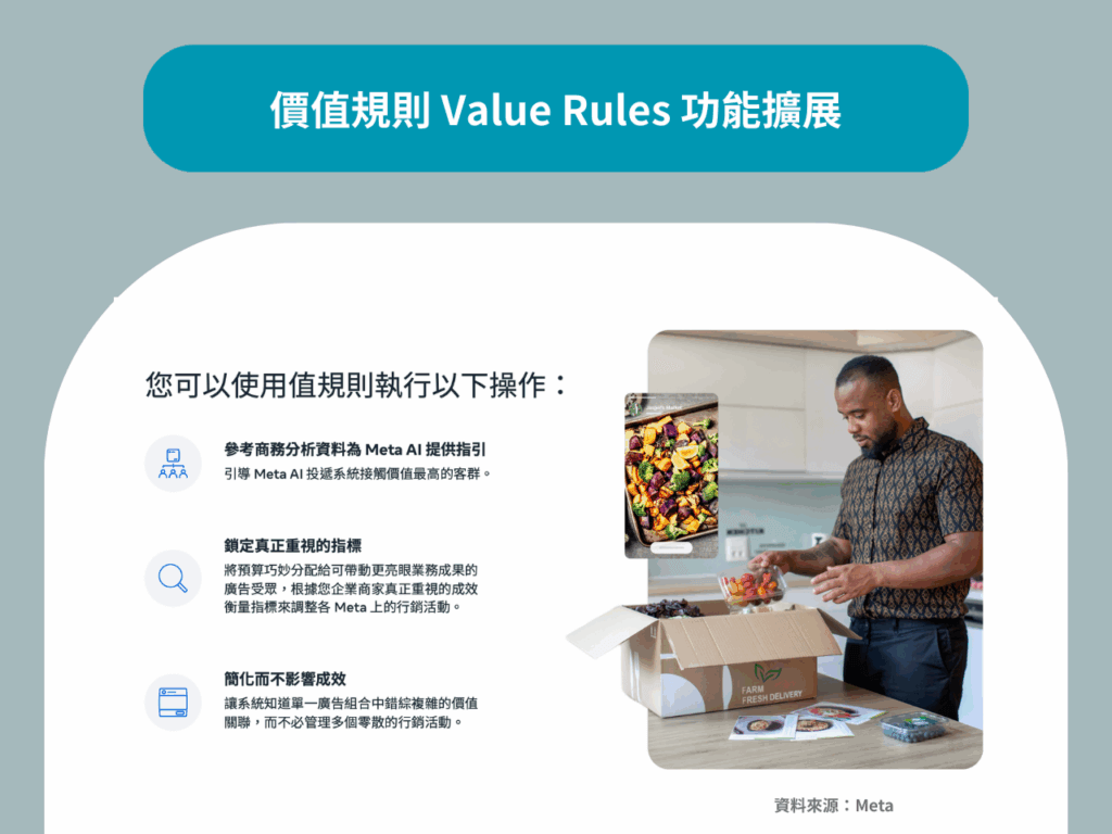 Meta 本月大幅擴增「價值規則」功能,支援更多目標、複數規則套用與進階調整。品牌主可依據不同商品、客群屬性,設計多組價值規則,創建自動化投放策略。例如,Ulla Popken 成效案例顯示,品牌藉由分群價值規則達到新客成本減半、轉換率 12 倍成長。最新功能、規則將於 2025 年 8 月 15 日擴及全球 50% 帳號,9 月 30 日覆蓋 100% 帳號。