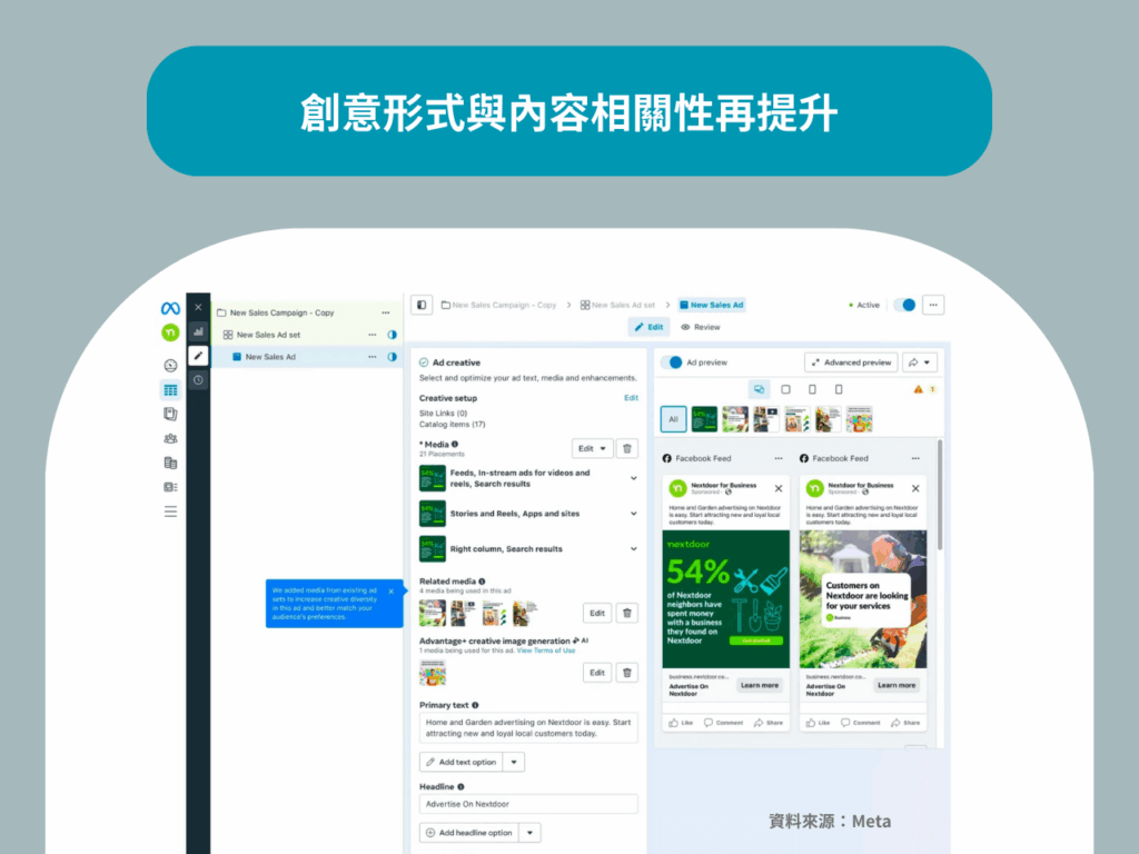 「Related Media」功能本月正式展開,主打提升廣告內容相關性及多維素材呈現。品牌主可整合影片、動態消息、限時動態、Reels……等,透過統一廣告活動內容結構,加深用戶印象並提高互動率。Meta 同時增設一站式管理、素材授權和內容分類,適合需要大量內容、多場景投放的電商品牌。