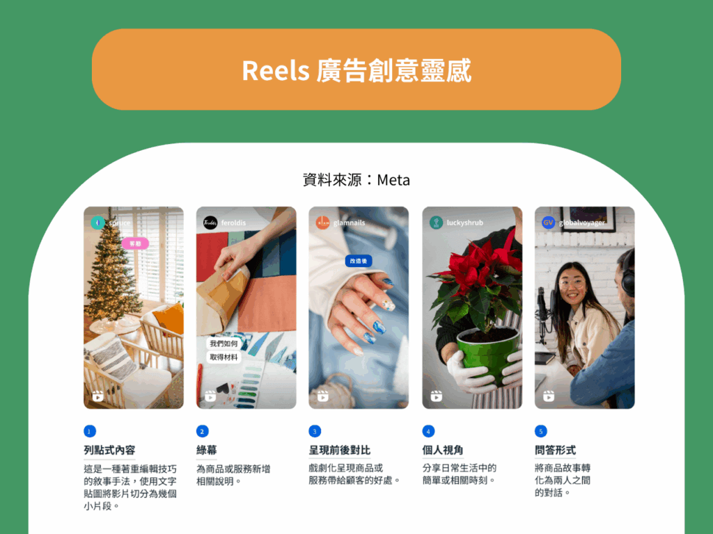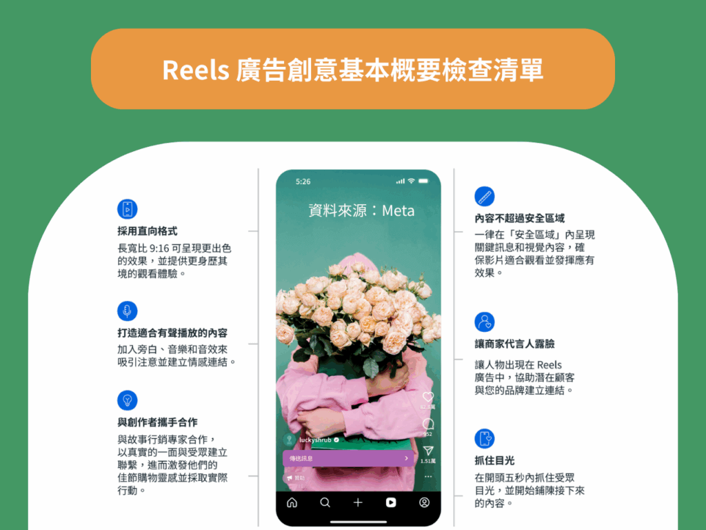 隨著影音消費成長,Meta 力推 Reels 短影音行銷。2024 年調查 79% 平台用戶看完 Reels 影片後曾購買商品。打造 Reels 廣告素材時,Meta 給予以下建議: