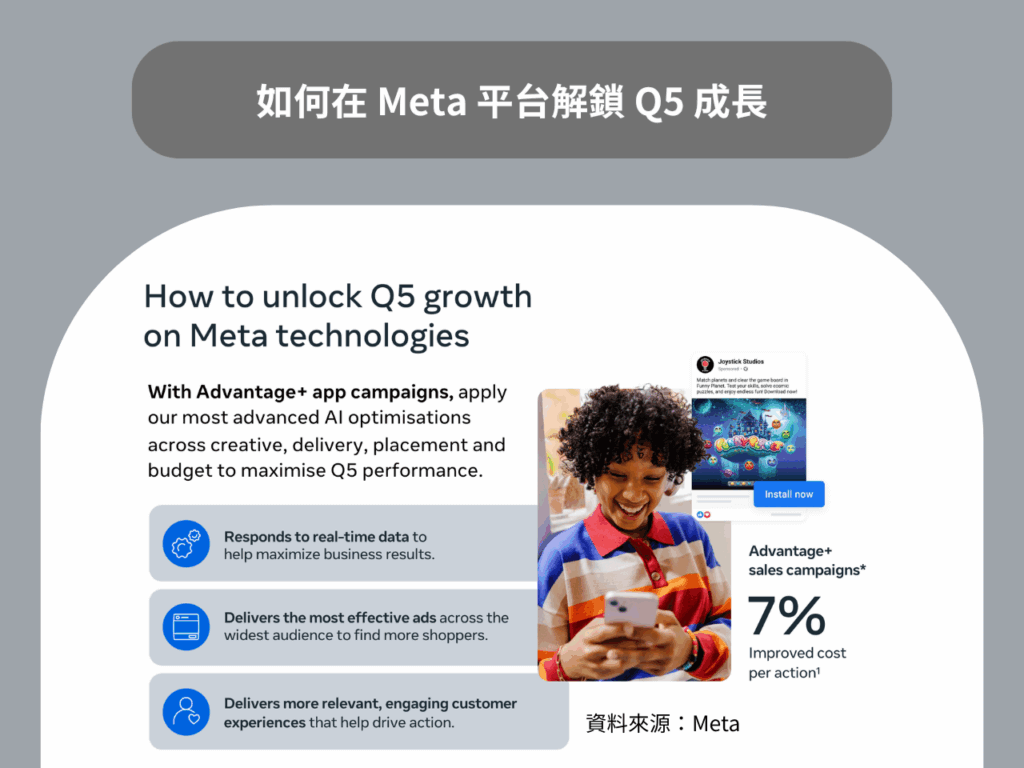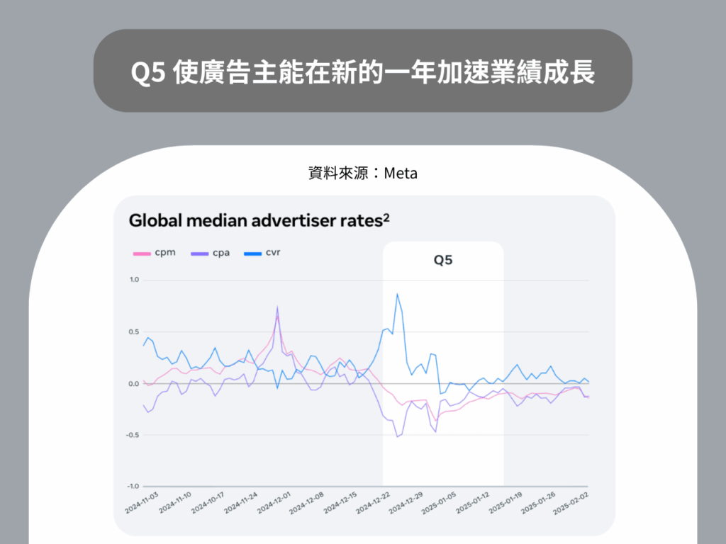 每年年底至隔年年初,是傳統的節慶促銷旺季,許多行銷人與企業競相爭奪消費者目光。Meta 針對這段時期,特別提出 Q5(12 月下旬至 1 月中)這個行銷黃金期的洞察與建議。在競品多已退出市場、運輸期限已過的 Q5 期間,手機遊戲開發者與 App 廣告主能夠以相對低成本,接觸到高度活躍且具消費意願的用戶,打破既有旺季銷售高峰的思維,開展新一波行銷成長。
