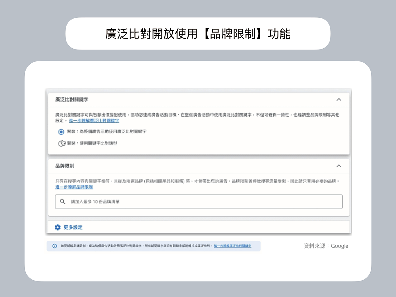 ① 搜尋廣告的廣泛比對功能目前已開放使用【品牌限制】功能。