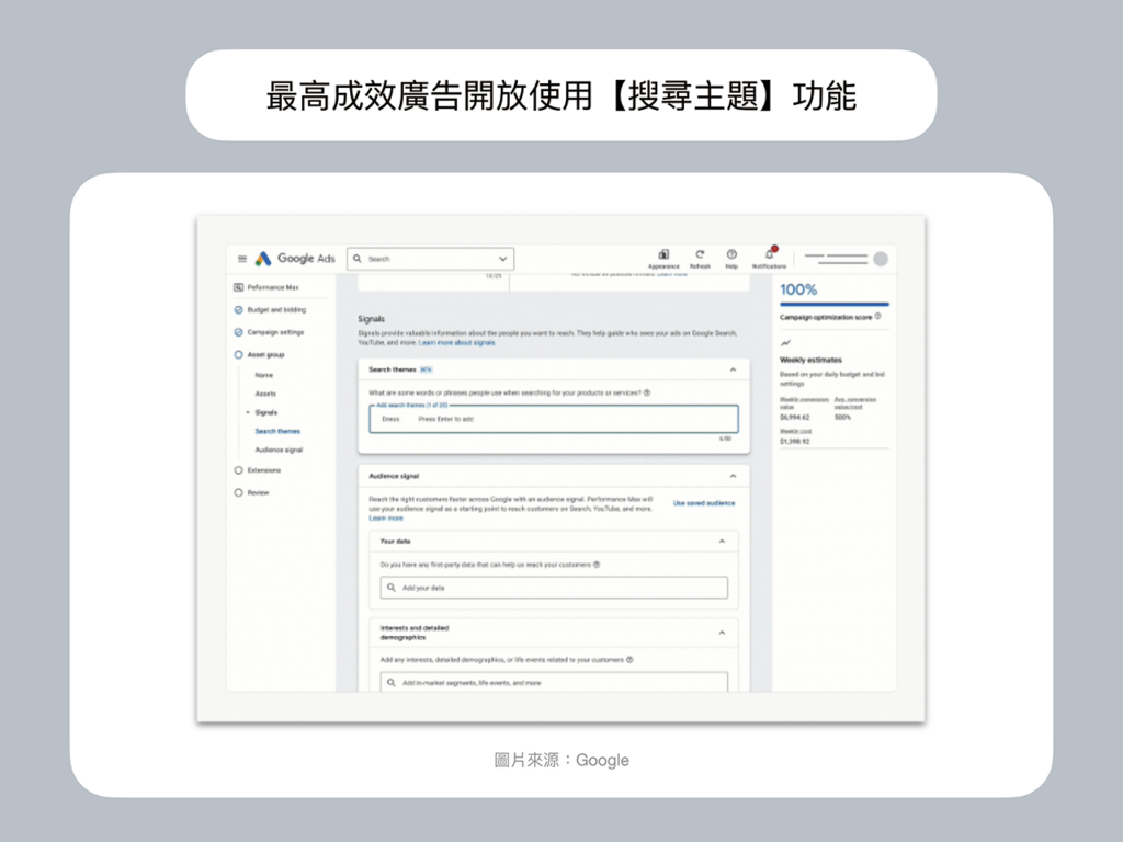 現在最高成效廣告(Performance Max)開放使用【搜尋主題】功能。搜尋主題可根據使用者的搜尋行為,在不同管道中尋找目標對象。Google AI 技術會根據帳戶中新增的搜尋主題,在所有Google Ads 廣告空間中,利用最高成效廣告觸及想要的流量。搜尋主題也能根據使用者的搜尋行為,在不同管道中尋找目標對象。