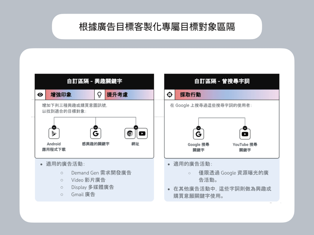 以【提升考慮、採取行動】為行銷目標,增加【Android 應用程式下載、感興趣的關鍵字、網址】三種興趣或購買意圖訊號,找到適合的目標對象。最後,搭配適合的廣告趁勝追擊!適用【自訂區隔-興趣關鍵字】的廣告如下: